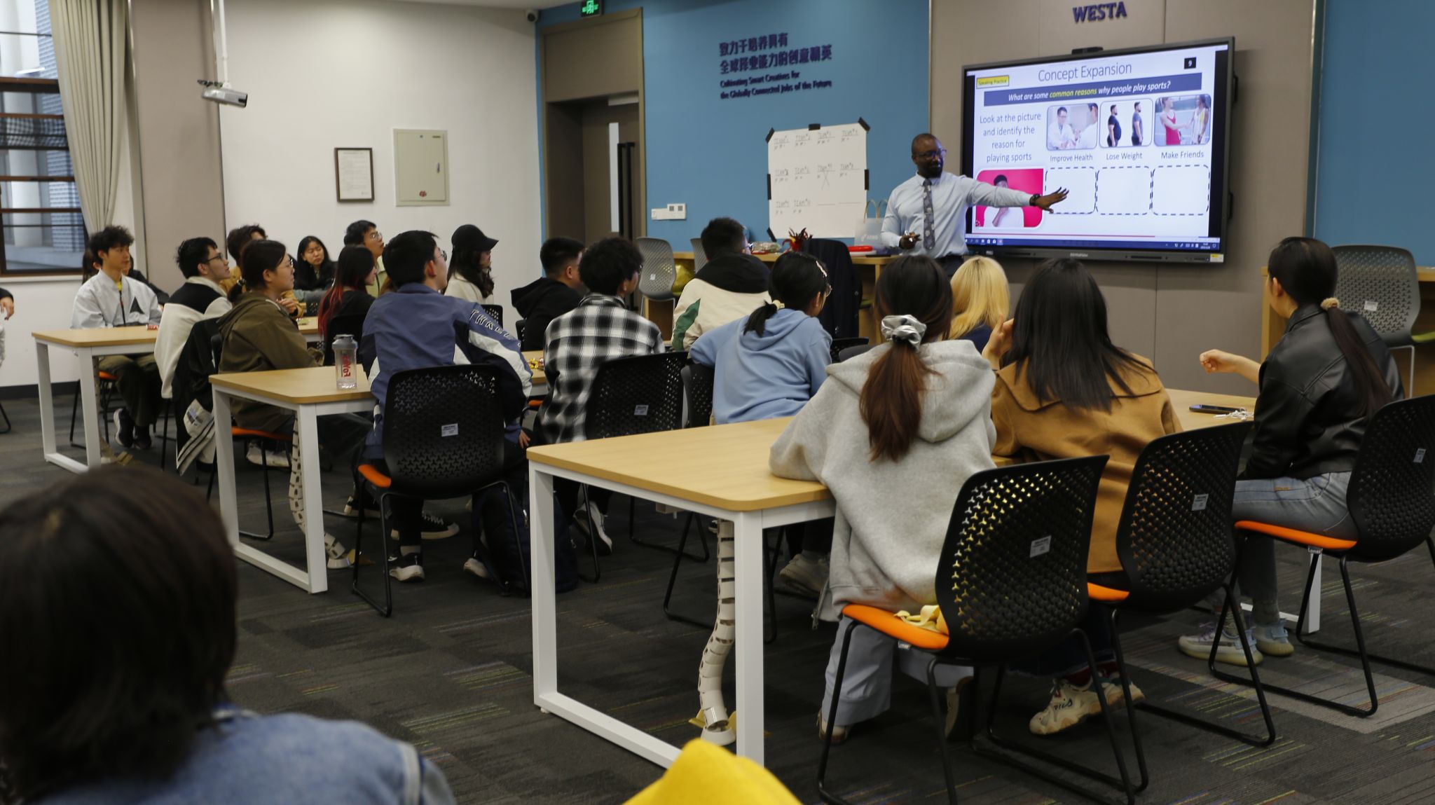 3月28日中午,英语演讲俱乐部在公司2214教室举办了主题为"Exploring Sports"的沉浸式英语角活动。本次活动邀请了外教Lovall、英语教师Chris和指导教师刘娇,吸引了50余名员工共同参与,通过英语实践与体育探索相结合,为师生们搭建了中外体育文化交流的平台。
