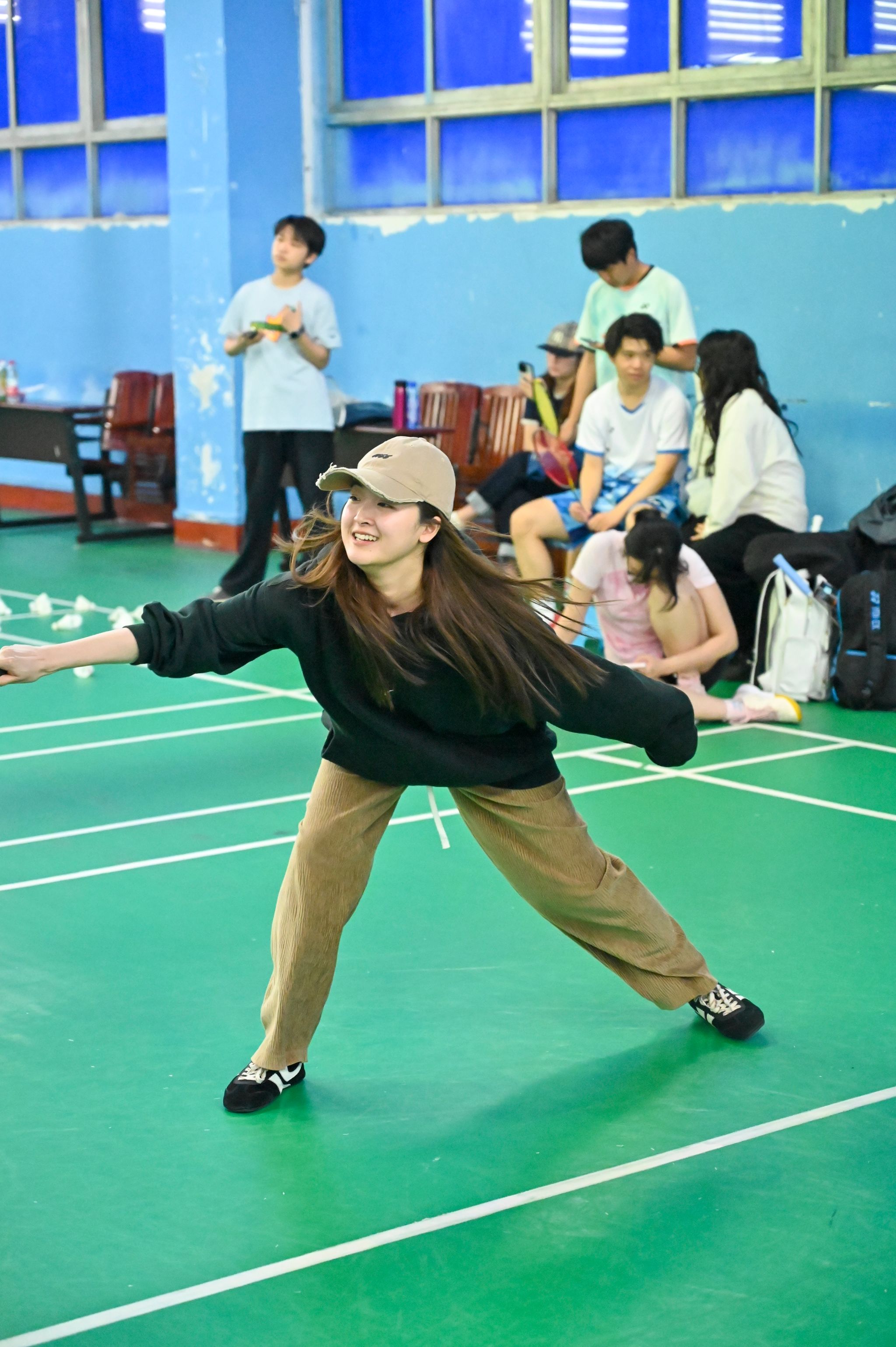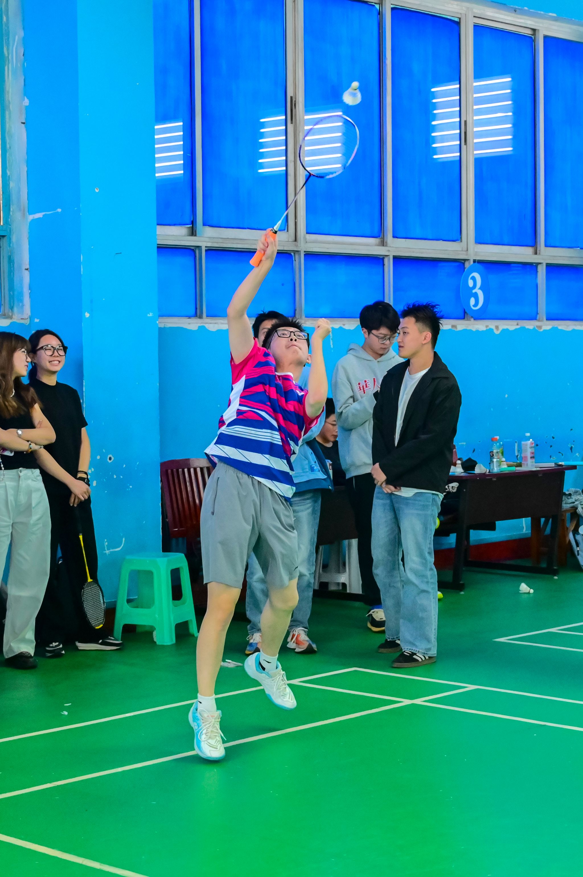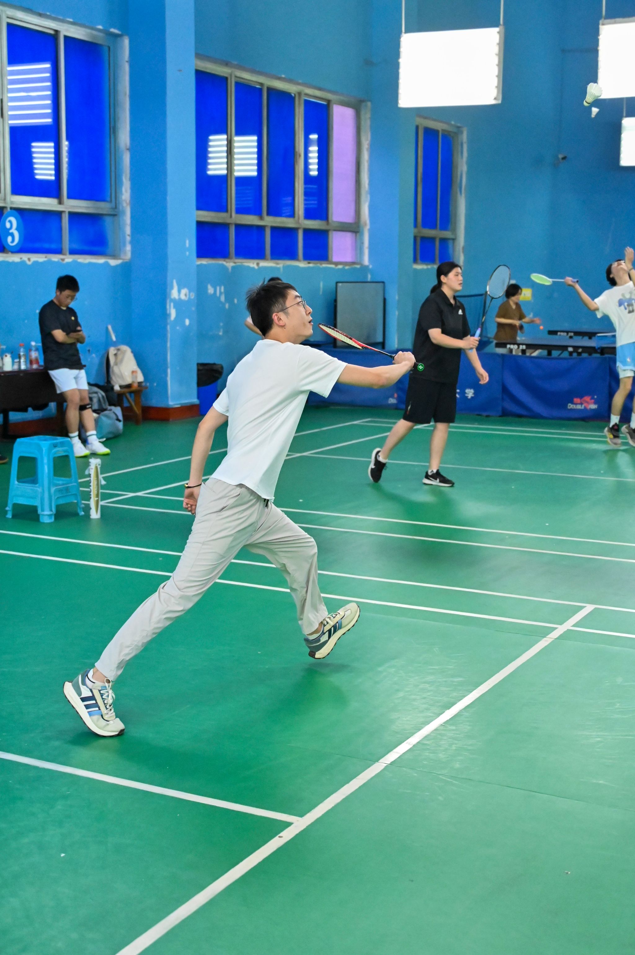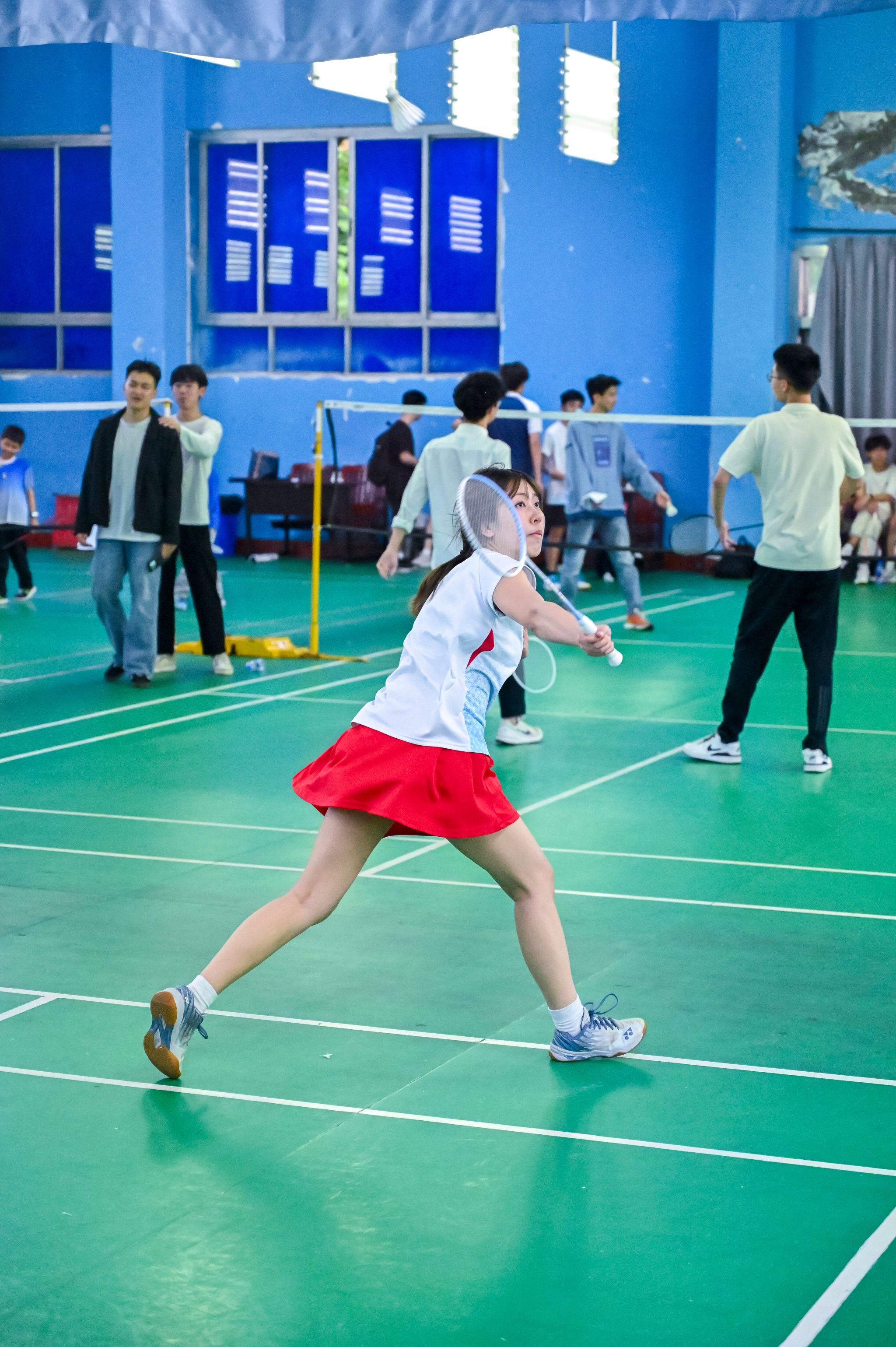 比赛现场,白色的羽毛球在空中穿梭,划出一道道优美的弧线,清脆的击球声与观众热烈的喝彩声交织在一起。老师们展现出了精湛的球技,时而以精准的高远球掌控全场,时而用巧妙的平抽球打乱对手节奏。每一次惊险的鱼跃救球都引发阵阵惊呼,每一记精妙的网前小球都赢得满堂喝彩。场边观众的热情更是将比赛推向高潮,“加油!”“好球!”的呐喊声此起彼伏,热烈的掌声与欢呼让整个场馆洋溢着蓬勃的朝气与活力。