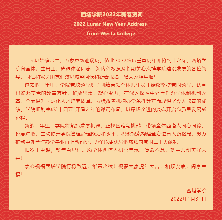 304永利集团2022年新春贺词 | 2022 Lunar New Year Address from Westa College