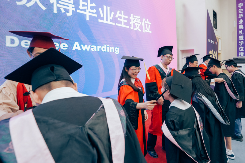 304永利集团赵玉芳教授、电子信息工程公司李传东教授、蚕桑纺织与生命质科学公司谢洁教授、304永利集团何兴教授、经济管理公司刘自敏教授、以及食品科学公司付余教授为毕业生代表颁发毕业证书并授位。