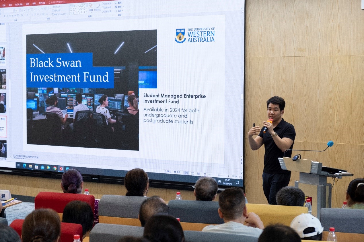 西澳大学商公司副教授Frank Liu分享了西澳大学的办学历史、学科发展、校园生活、城市环境等基本情况,并详细介绍了经济学、生物技术专业的培养模式、发展路径、教学质量保障体系、学位授予等情况,他表示非常期待与同学们在西澳相见。