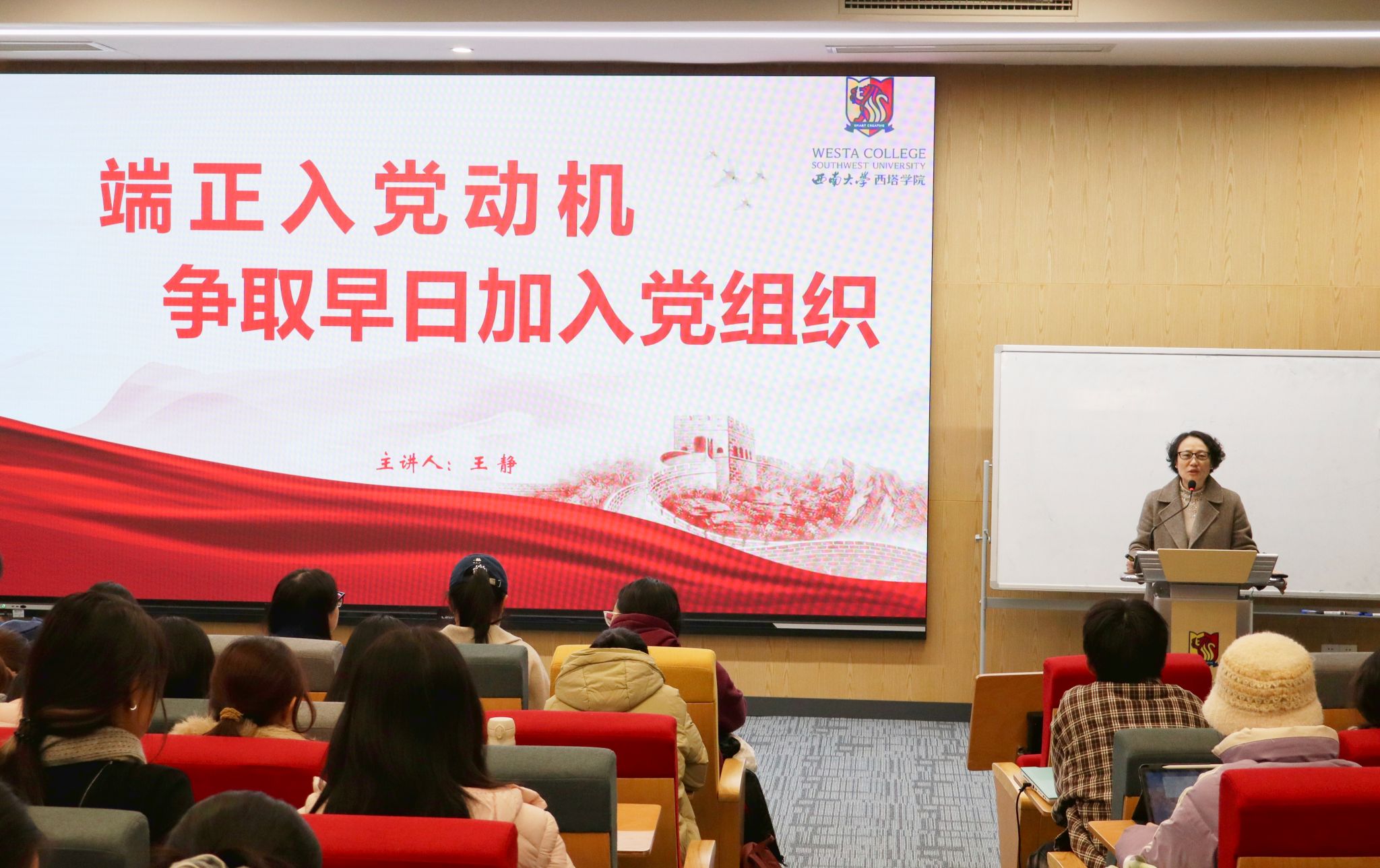最后,王静书记就如何端正入党动机提出实践路径。她强调,要强化理论武装,厚植宗旨意识,对标先进典型,做到四个统一。鼓励同学们积极投身社会实践,夯实学业基础,将远大理想融入脚踏实地的行动,让青春在推进中国式现代化的进程中绽放绚丽之花。