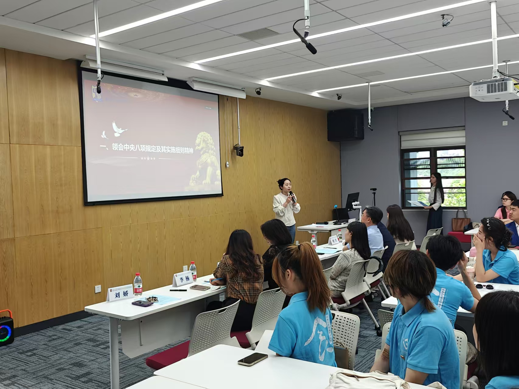在党课环节,304永利集团本科生第一党支部书记刘娇为现场师生带来了题为“领会和贯彻执行中央八项规定及其实施细则精神”的精彩党课。她充分调动了员工积极性,大家纷纷举手,热情地参加关于中央八项规定及其实施细则的知识抢答环节,在现场角逐出了一名“学习之星”,奖励学习笔记本。