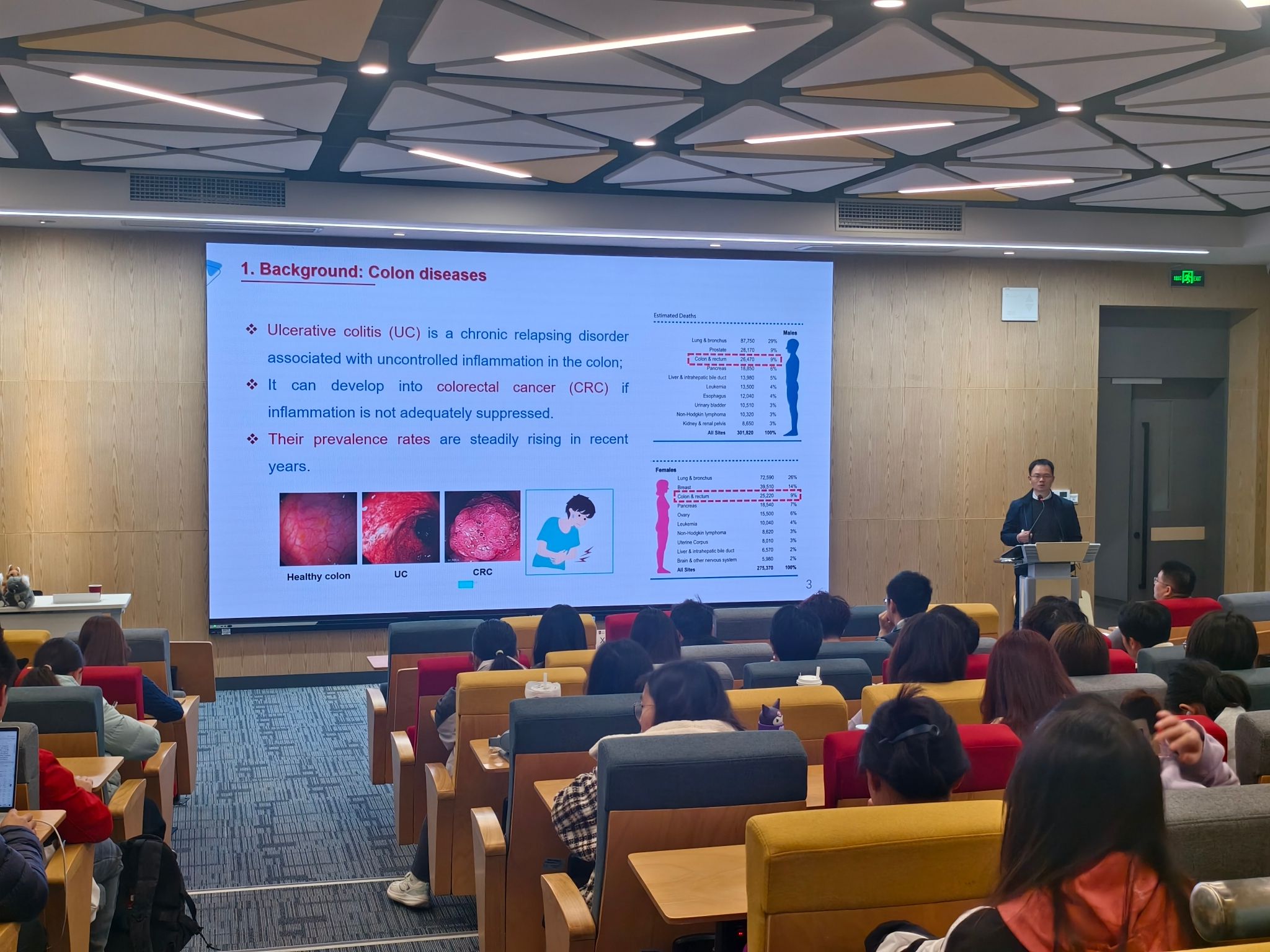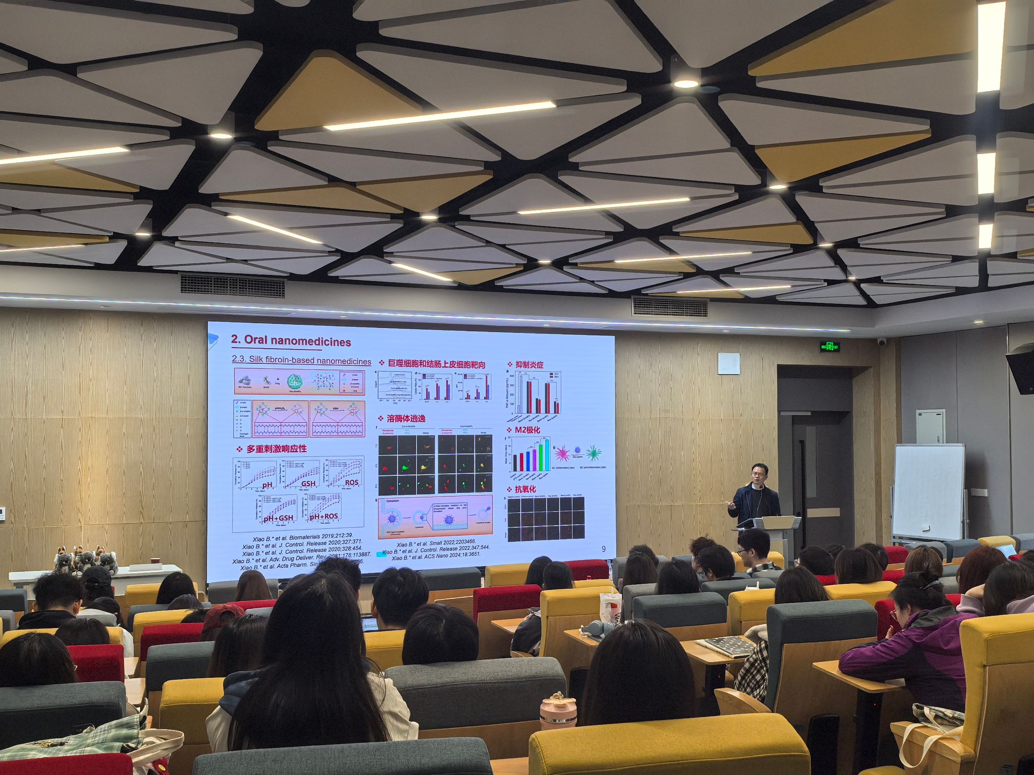 在生物技术专业专场讲座上,肖波教授以“‘绿色’口服纳米药物”为主题,系统介绍其团队当前重要研究成果。针对传统口服药物面临的胃酸、酶解及黏液屏障等难题,其团队创新性地从茶叶、茶树花和桑叶中提取纯天然植物脂质囊泡,构建出兼具靶向性与安全性的类外泌体纳米药物,并通过实验数据证明其突出的临床转化潜力。在溃疡性结肠炎治疗案例中,其团队通过光热响应材料与近红外控温技术,实现药物穿透黏液层并靶向释放,疗效优于现有临床药物。针对粪菌移植领域面临的菌群易失活、引发免疫系统激活等问题,采用水凝胶包裹技术增强菌群移植活性并调节免疫,显著缓解了肠道炎症。同时,团队提出并验证了经口服纳米药物驯化的肠道菌群的胞外囊泡可替代临床上广泛使用的粪菌移植治疗策略。